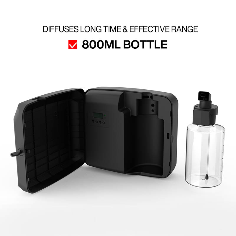 The 800ml scent diffuser is compatible with both LCD programming and the APP. It operates very quietly and offers optional outlets for both HVAC and direct output. It covers an area of 1500-5000 cubic meters, making it ideal for large rooms.